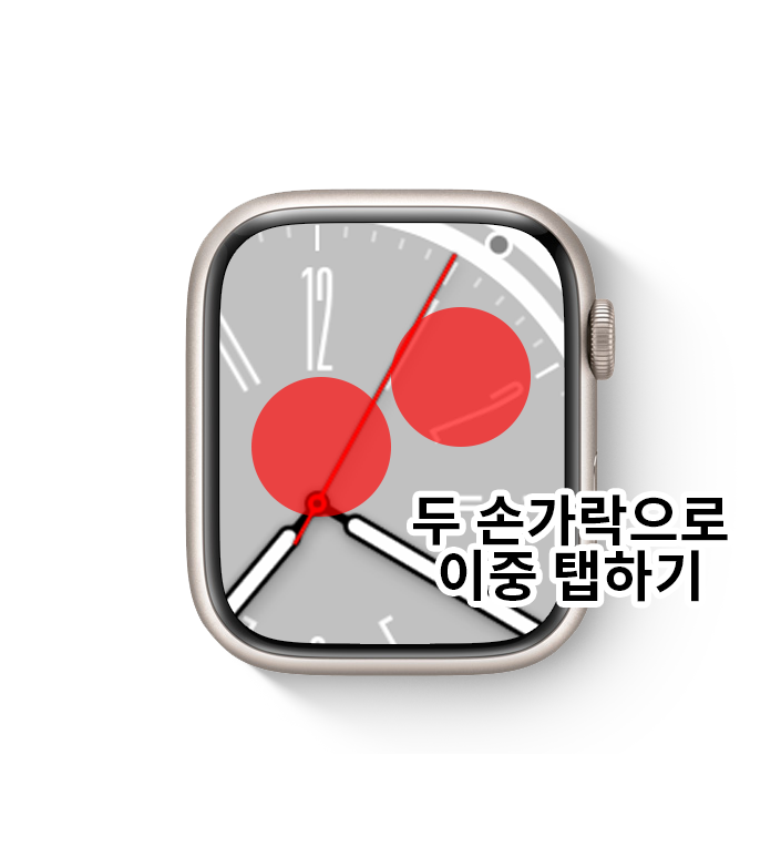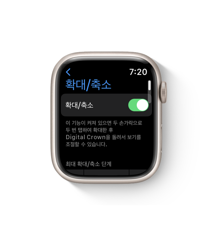 다음으로 애플 워치의 확대 또는 축소 기능에 대해 알아보겠습니다. 기기를 사용하는 도중 갑자기 화면이 확대되었다면 다음과 같은 방법을 통해 확대된 화면을 축소시킵니다.