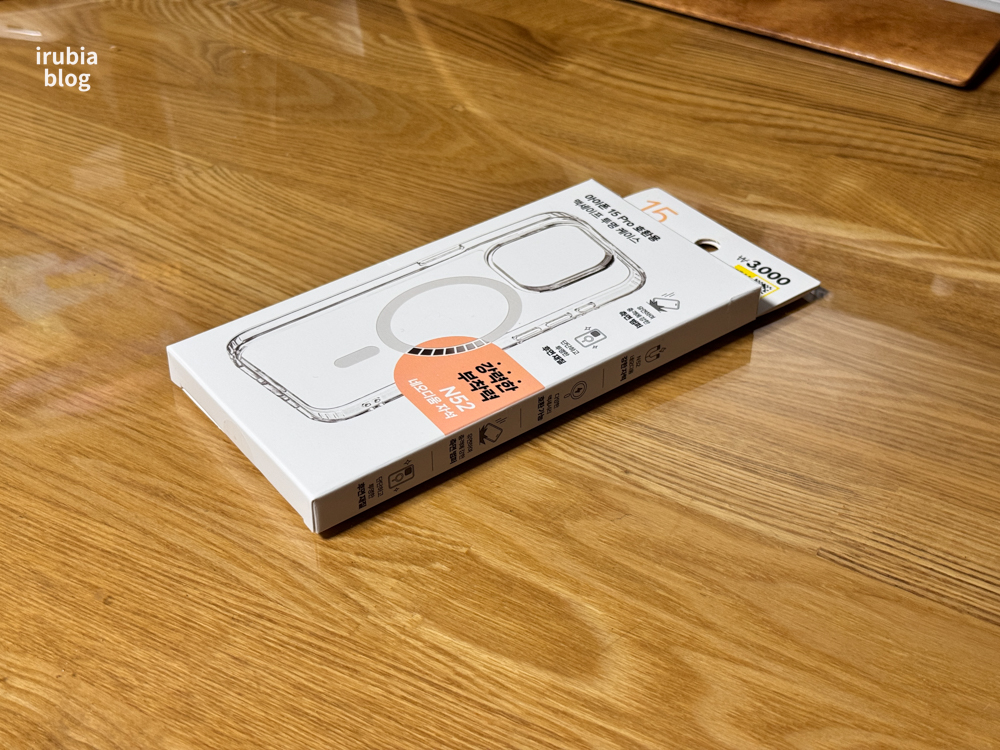 다이소에서 판매하는 iPhone 15 Pro 호환용 맥세이프 투명 케이스의 포장 박스입니다.